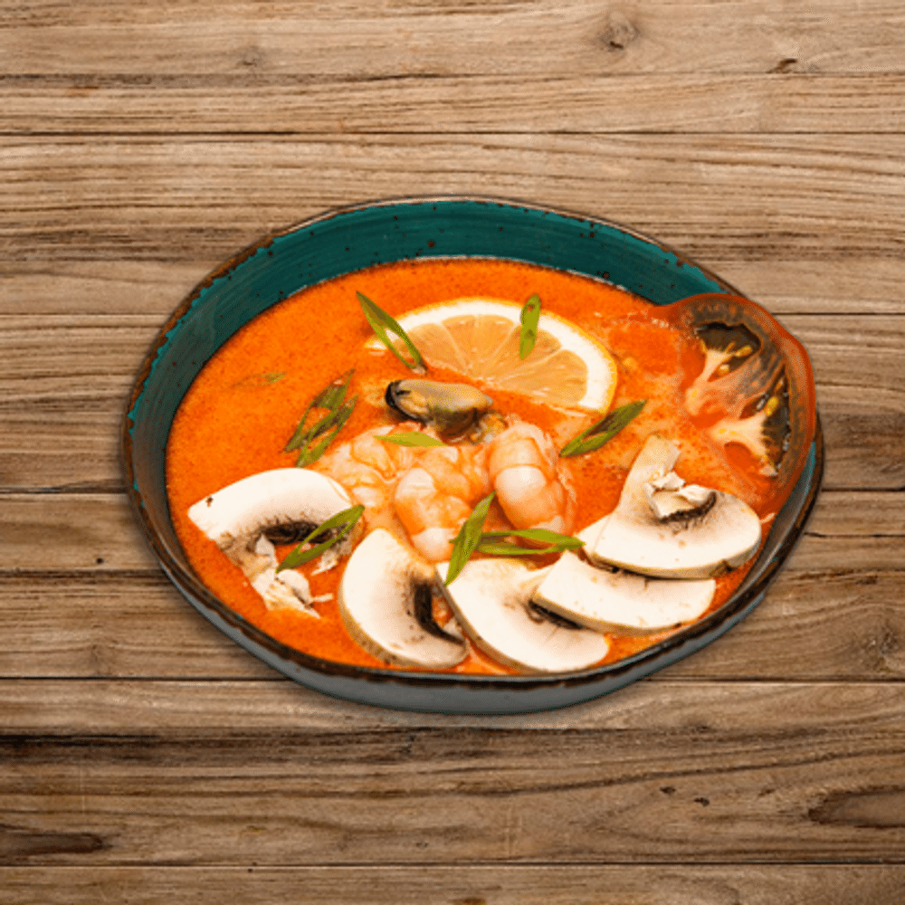 Тайский суп со сливками, грибами шиитаки, томатом, зеленым луком, ломтиком лимона и морским коктейлем (мидии, тигровая креветка, кальмар)