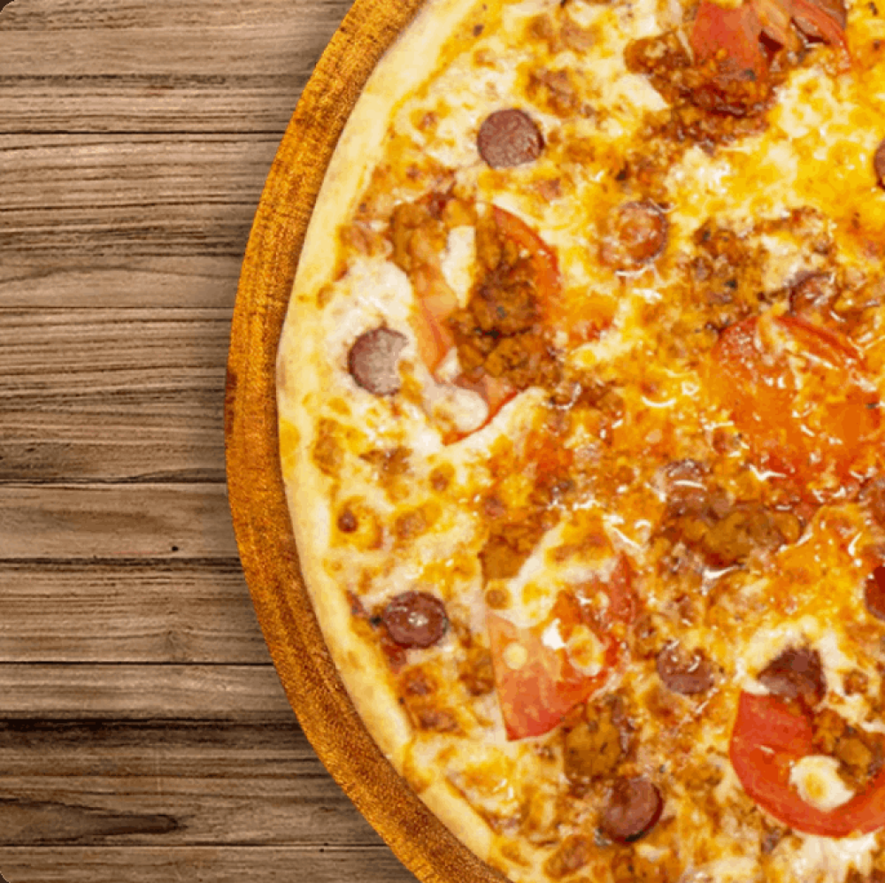 Томатная основа, Соус Болоньезе ( свиной фарш) , Охотничьи Колбаски, Томат, Моцарелла сыр